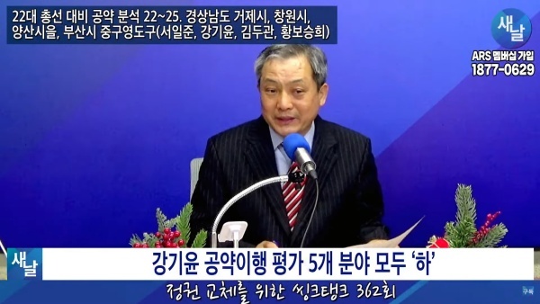 12월26일(화요일) 새날 유튜브 방송은 2020년 21대 국회의원 선거에서 당선된 경상남도 창원시 성산구 강기윤 의원이 제시한 선거공약을 평가했다. 평가를 위한 방송에는 푸른나무, 이상구 원장, 민진규 소장(국가정보전략연구소, iNIS) 등이 출연했다.