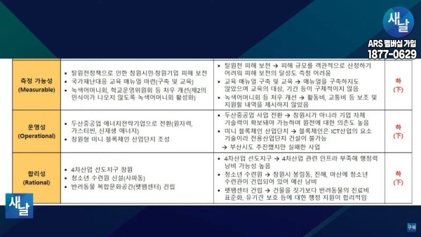 셋째, 측정 가능성(Measurable) 측면에서 보면 탈원전으로 인한 창원 시민과 창원 기업들의 피해를 보전하겠다는 공약은 창원은 원전 자체도 없을 뿐 아니라 피해 규모를 객관적으로 산정하기 어려워 피해 보전의 달성도 측정 어려운 공약으로 평가되었습니다. 오히려 친원전 공약으로 인한 피해를 어떻게 할 것인지에 대해 이제 논의를 시작해야 할 것으로 보입니다.