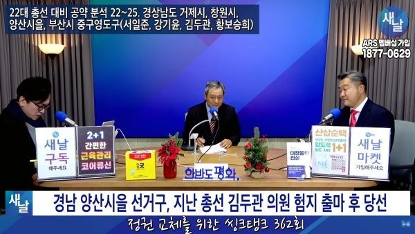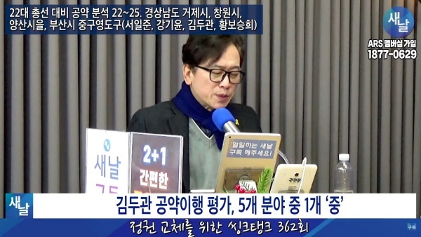 12월26일(화요일) 새날 유튜브 방송은 2020년 21대 국회의원 선거에서 당선된 경상남도 양산시을 김두관 의원이 제시한 선거공약을 평가했다. 평가를 위한 방송에는 푸른나무, 이상구 원장, 민진규 소장(국가정보전략연구소) 등이 출연했다.