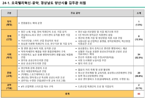 경남 양산시을 지역구의 김두관 의원은 베드타운을 탈피하기 위해 산업기반 구축이 절실하지만, 경제산업 및 과학기술 공약이 총 15%에 불과할 정도로 비중이 낮았습니다.
