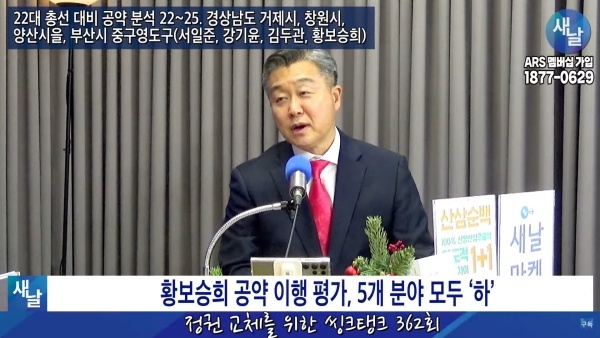 12월26일(화요일) 새날 유튜브 방송은 2020년 21대 국회의원 선거에서 당선된 부산광역시 중구·영도구 황보승희 의원이 제시한 선거공약을 평가했다. 평가를 위한 방송에는 푸른나무, 이상구 원장, 민진규 소장(국가정보전략연구소)이 출연했다.