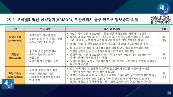 [국회의원 공약 평가] 25. 새날 방송, 부산광역시 중구·영도구 황보승희 의원···달성가능성 등 5개 부문 모두 하(下) 231226
