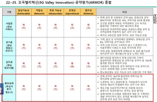 전체적으로 경상남도와 부산시의 주요 도시들인 이들 지역구의원의 공약을 보면 지역 발전이나 공약의 실효성이 낮은 것들이 대부분이라 모든 측면에서의 공약이 <하>로 평가되었습니다.