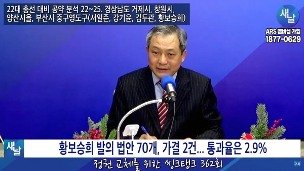 12월26일(화요일) 새날 유튜브 방송은 2020년 21대 국회의원 선거에서 당선된 경상남도 거제시 서일준 의원, 창원시 성산구 강기윤 의원, 양산시을 김두관 의원, 부산광역시 중구·영도구 황보승희 의원이 제시한 선거공약을 평가했다. 이번에는 부산광역시 중구·영도구 황보승희 의원이 제시한 선거공약 평가 내용을 소개한다.