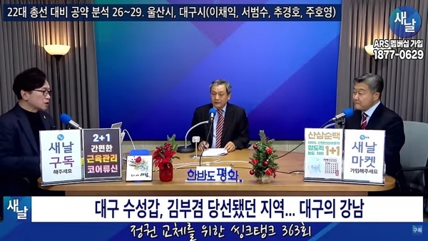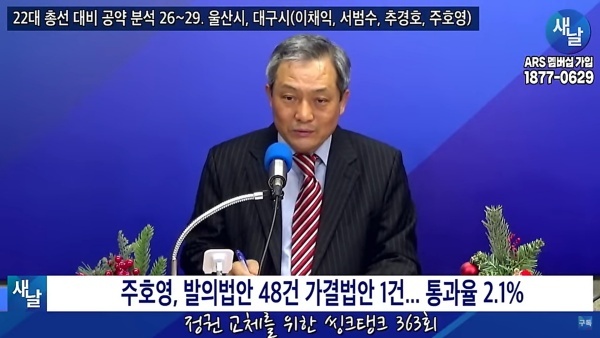 2024년01월06일(토요일) 새날 유튜브 방송은 2020년 21대 국회의원 선거에서 당선된 울산광역시 남구갑 이채익, 울주군 서범수, 대구광역시 달성군 추경호, 수성구갑 주호영 의원이 제시한 선거공약을 평가했다. 이번에는 대구광역시 수성구갑 주호영 의원이 제시한 선거공약 평가 내용을 소개한다.