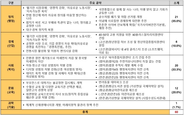 21대에 제시한 60개 공약은 정치(행정)(21)·경제(산업)(6)·사회(복지)(20)·문화(교육)(12)·과학(기술)(1) 등으로 구성됐으며 △정치(행정) 공약이 전체의 35.0%를 차지했다. 다음으로 사회(복지) 공약 33.3% △문화(교육) 공약 20.0% △경제(산업) 공약 10.0% △과학(기술) 공약 1.7%를 각각 기록했다.