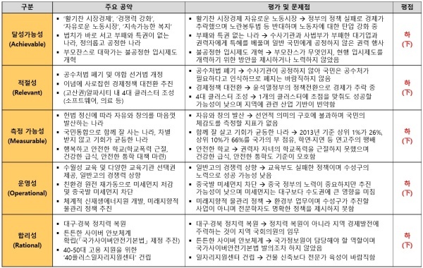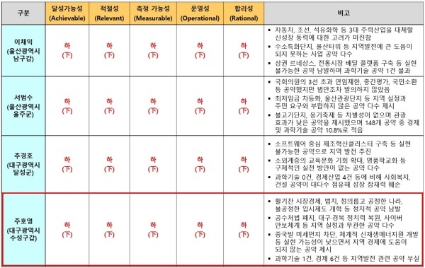 주호영 의원이 제시한 60개 공약은 △달성가능성 △적절성 △측정가능성 △운영성 △합리성 등 5개 영역 모두에서 최하인 하(下) 평점을 받았다.