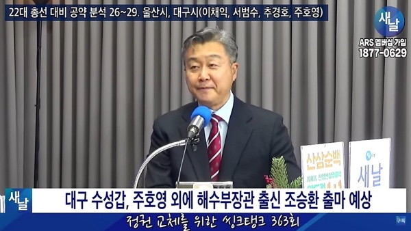 2024년01월06일(토요일) 새날 유튜브 방송은 2020년 21대 국회의원 선거에서 당선된 대구광역시 수성구갑 주호영 의원이 제시한 선거공약을 평가했다. 평가를 위한 방송에는 푸른나무, 이상구 원장, 민진규 소장(국가정보전략연구소) 등이 출연했다.