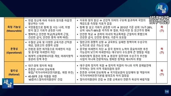 셋째, 측정 가능성(Measurable) 측면에서 보면 대부분의 공약이 상당히 추상적인 슬로건으로 되어 있어 측정이 불가능했습니다. 헌법의 정신에 따라 자유와 창의를 마음껏 발산하는 나라를 선언하였는데 선언적 의미의 구호에 불과하며 국민의 체감도를 측정할 지표가 없습니다