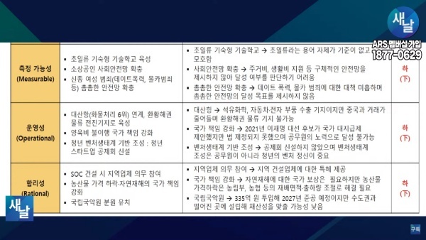 셋째, 측정 가능성(Measurable) 측면에서 보면 초일류 기숙형 기술학교 육성을 공약했지만 초일류라는 용어 자체가 기준이 없고 모호해 공약의 측정 가능성이 낮게 평가됐습니다.