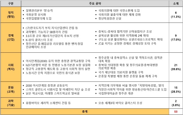 전체적으로 충청남도와 충청북도의 주요 지역구 의원의 공약을 보면 지역 발전이나 공약의 실효성이 낮은 것들이 대부분이라 모든 측면에서의 공약이 <하>로 평가됐습니다.