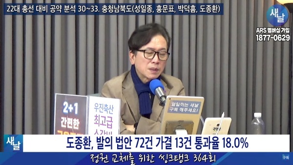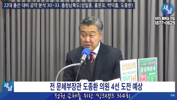 2024년01월09일(화요일) 새날 유튜브 방송은 2020년 21대 국회의원 선거에서 당선된 충청북도 청주시 흥덕구 도종환 의원이 제시한 선거공약을 평가했다. 평가를 위한 방송에는 푸른나무, 이상구 원장, 민진규 소장(국가정보전략연구소)이 출연했다.