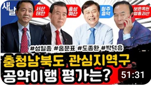 ▲ 충청남북도 지역 국회의원 공약평가 방송(성일종, 홍문표, 박덕흠, 도종환 의원) [출처 = 새날 유튜브]