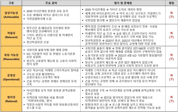 도종환 의원이 제시한 53개 공약은 서산시·태안군 성일종 의원, 홍성군·예산군 홍문표 의원, 충청북도 보은군·옥천군·영동군·괴산군 박덕흠 의원과 마찬가지로 △달성가능성 △적절성 △측정가능성 △운영성 △합리성 등 5개 영역 모두에서 최하인 하(下) 평점을 받았다.