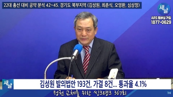 2024년01월30일(화요일) 새날 유튜브 방송은 2020년 21대 국회의원 선거에서 당선된 경기도 동두천시·연천군 김성원 의원이 제시한 선거공약을 평가했다. 평가를 위한 방송에는 푸른나무, 이상구 원장, 민진규 소장(국가정보전략연구소)이 출연했다.
