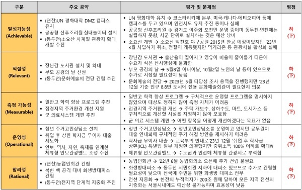 김 의원이 제시한 100개 공약은 △달성가능성 △적절성 △측정가능성 △운영성 △합리성 등 5개 영역에서 모두 최하인 하(下) 평점을 받았다.