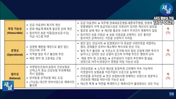 셋째, 측정 가능성(Measurable) 측면에서 보면 응급 의료센터 획기적 개선 공약의 경우 여주에 연세새로운 병원 · 세종여주병원, 양평에 양평병원이 지역 응급의료시설로 지정되어 있지만 아직까지 추가로 지정되거나 시설이 획기적으로 개선되지 않았습니다.