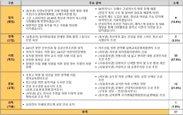 경기도 안성시 김학용 의원은 총 57개 공약 중 사회복지 33개(57%), 문화교육 12개(21%)인 반면 경제산업 2개(3%), 과학기술 1개(1%)로 편중되어 있었습니다.