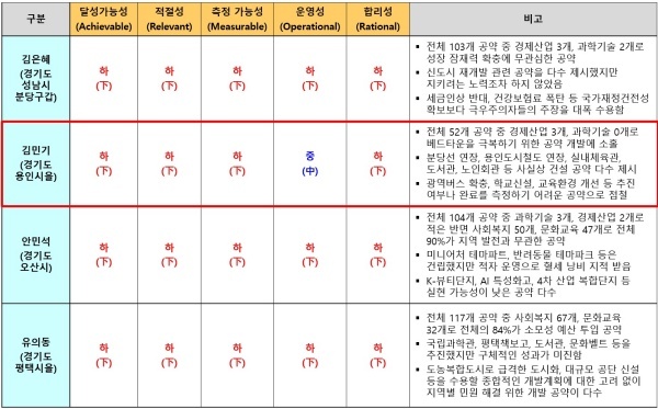 김 의원이 제시한 52개 공약은 △운영성 측면에서 중(中)으로 평가됐으나 △달성가능성 △적절성 △측정가능성 △합리성 등 4개 영역 모두 최하인 하(下) 평점을 받았다.