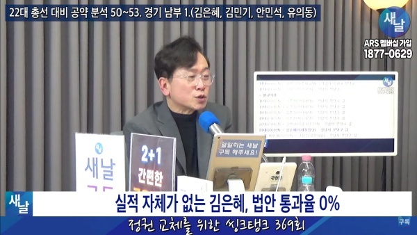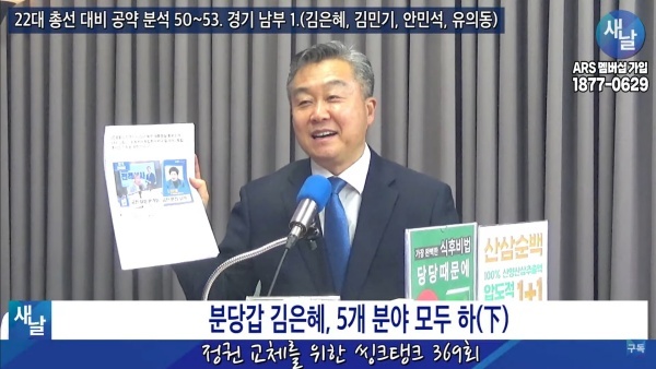 2024년02월13일(화요일) 새날 유튜브 방송은 2020년 21대 국회의원 선거에서 당선된 경기도 성남시 분당구갑 김은혜 전의원이 제시한 선거공약을 평가했다. 평가를 위한 방송에는 푸른나무, 이상구 원장, 민진규 소장(국가정보전략연구소)이 출연했다.