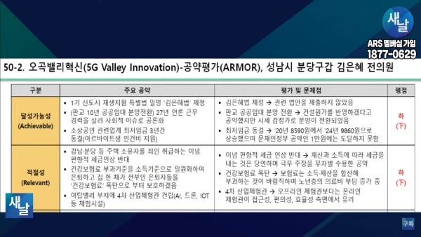 [국회의원 공약 평가] 50. 새날 방송, 경기도 성남시 분당구갑 김은혜 전의원···달성가능성 등 5개 부문 모두 하(下)