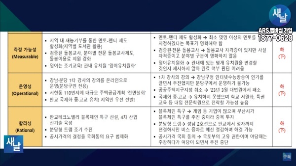 셋째, 측정 가능성(Measurable) 측면에서 보면 지역 내 재능기부를 통해 멘토-멘티 제도 활성화를 공약으로 제시햇는데 최소 몇 명 이상의 멘토를 지정하겠다는 목표가 명확해야 하는데 그런 내용이 전혀 없었습니다.