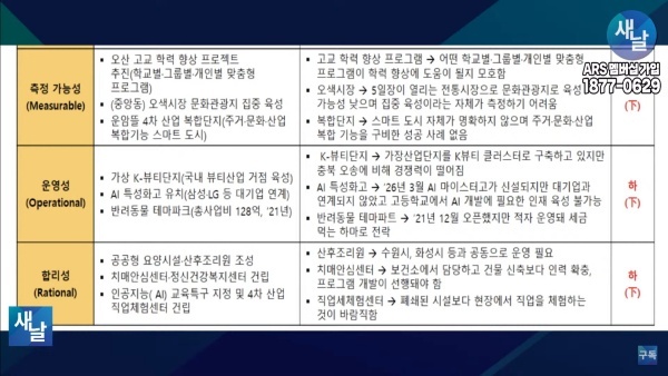 셋째, 측정 가능성(Measurable) 측면에서 보면 학교별, 그룹별, 개인별 맞춤형 오산 고교 학력 향상 프로젝트 추진 공약의 경우 어떤 학교별·그룹별·개인별 맞춤형 프로그램이 학력 향상에 도움이 될지 모호해 측정 가능성이 낮게 평가되었습니다.