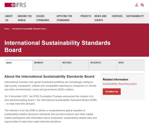 ISSB는 2021년 11월 COP26에서 국제회계기준(IFRS) 재단에 의해 설립됐다. ESG와 관련된 추가 주제를 기반으로 다수의 추가 표준을 제정할 예정이다.