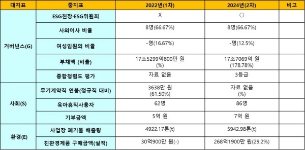 △거버넌스(Governance·지배구조)=거버넌스는 2022년 ESG 경영은 선언했지만 ESG 경영 헌장을 제정하지 않았을 뿐 아니라 ESG 위원회도 구성하지 않았다. 하지만 2023년 녹색도시부를 신설해 환경 부문을 담당하도록 조치했다.