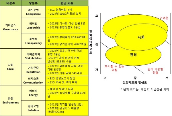 △거버넌스(Governance·지배구조)=거버넌스는 2022년 ESG 경영선포식을 거행했지만 낙제점을 벗어나지 못했다. ESG 헌장을 제정하지 않았으며 ESG소위원회의 활동이 효과가 있는지도 의문이기 때문이다.
