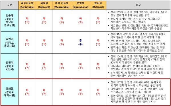 유 의원이 제시한 117개 공약은 △달성가능성 △적절성 △측정가능성 △운영성 △합리성 등 5개 영역 모두 최하인 하(下) 평점을 받았다.
