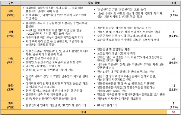 수원시 무 선거구의 김진표 의원은 전체 53개 공약 중 과학기술(2%), 경제산업(15%)로 직주근접형 도시 구현에 대한 고려가 부족했습니다.