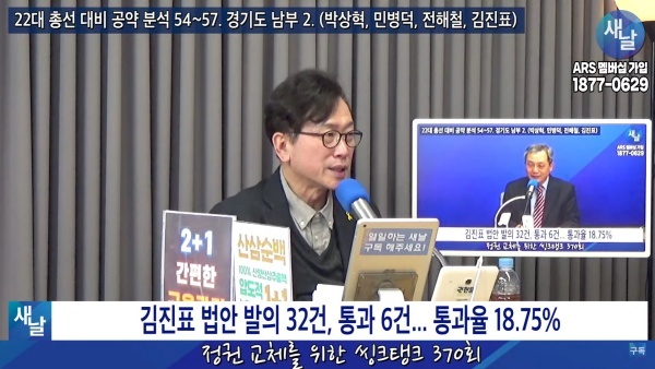2024년02월20일(화요일) 새날 유튜브 방송은 2020년 21대 국회의원 선거에서 당선된 경기도 수원시무 김진표 의원이 제시한 선거공약을 평가했다. 평가를 위한 방송에는 푸른나무, 이상구 원장, 민진규 소장(국가정보전략연구소)이 출연했다.