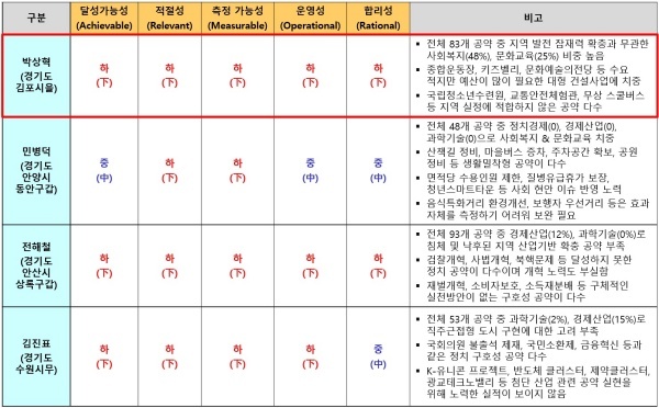 박 의원이 제시한 83개 공약은 △달성가능성 △적절성 △측정가능성 △운영성 △합리성 등 5개 영역 모두 최하인 하(下) 평점을 받았다.