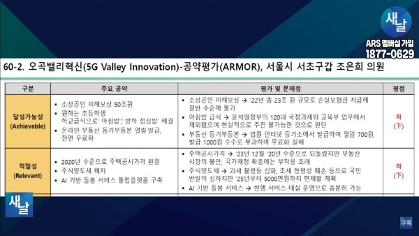 [국회의원 공약 평가] 60. 새날 방송, 서울시 서초구갑 조은희 의원···달성가능성 등 5개 부문 모두 하(下)