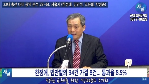 2024년02월27일(화요일) 새날 유튜브 방송은 2020년 21대 국회의원 선거에서 당선된 서울시 강서구병 한정애 의원이 제시한 선거공약을 평가했다. 평가를 위한 방송에는 푸른나무, 이상구 원장, 민진규 소장(국가정보전략연구소)이 출연했다.
