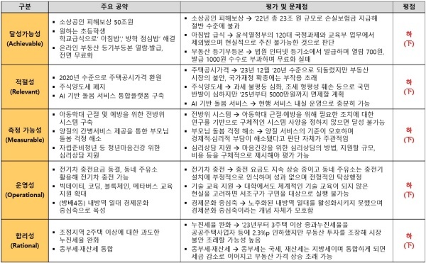 조 의원이 제시한 68개 공약은 △달성가능성 △적절성 △측정가능성 △운영성 △합리성 영역 등 5개 영역 모두 최하인 하(下) 평점을 받았다.