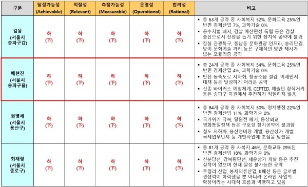 배 의원이 제시한 24개 공약은 △달성가능성 △적절성 △측정가능성 △운영성 △합리성 영역 등 5개 영역 모두 최하인 하(下) 평점을 받았다.