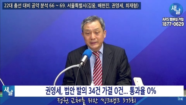 2024년03월12일(화요일) 새날 유튜브 방송은 2020년 21대 국회의원 선거에서 당선된 서울시 용산구 권영세 의원이 제시한 선거공약을 평가했다. 평가를 위한 방송에는 푸른나무, 이상구 원장, 민진규 소장(국가정보전략연구소)이 출연했다.