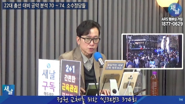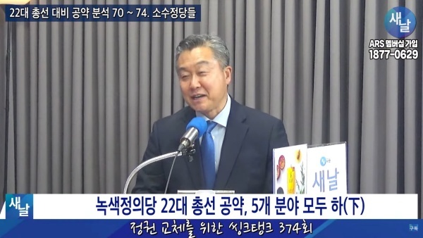 2024년03월26일(화요일) 새날 유튜브 방송은 2024년 22대 국회의원 선거를 위해 녹색정의당이 제시한 선거공약을 평가했다. 평가를 위한 방송에는 푸른나무, 이상구 원장, 민진규 소장(국가정보전략연구소)이 출연했다.