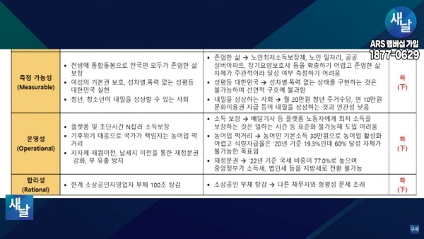 셋째, 측정 가능성(Measurable) 측면에서 보면 전생애 통합돌봄으로 전국민 모두가 존엄한 삶을 보장한다는 공약은 노인 최저소득보장제, 노인 일자리, 공공 실버아파트, 장기요양보호사 확충 등으로 존엄한 삶을 보장하기 어렵고 존엄한 삶 자체가 주관적이라 달성 여부 측정하기 어려운 공약으로 평가됩니다.