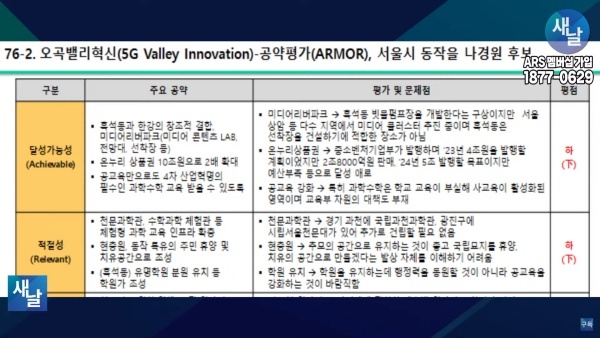 둘째, 적절성(Relevant) 측면에서는 천문과학관, 수학과학체험관 등 체험형 과학교육 인프라 확충 공약의 경우에 이미 과천에 국립과천과학관, 광진구에 시립서울천문대가 있어 추가로 건립할 필요 없는 공약입니다.