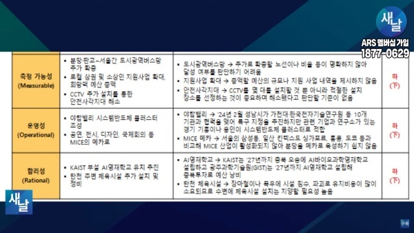 셋째, 측정 가능성(Measurable) 측면에서 보면 분당, 판교-서울간 도시 광역 버스망 추가 확충 공약의 경우 추가로 확충할 노선이나 비율 등이 명확하지 않아 달성 여부를 판단하기 어려운 공약입니다.
