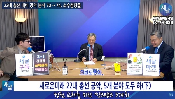 2024년03월26일(화요일) 새날 유튜브 방송은 2024년 22대 국회의원 선거를 위해 새로운미래가 제시한 선거공약을 평가했다. 평가를 위한 방송에는 푸른나무, 이상구 원장, 민진규 소장(국가정보전략연구소)이 출연했다.