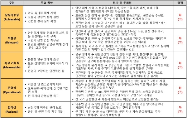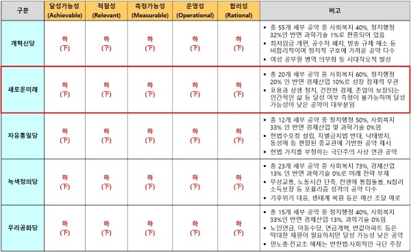 새로운미래가 제시한 20개 공약은 △달성가능성 △적절성 △측정가능성 △운영성 △합리성 영역 등 5개 영역 모두 최하인 하(下) 평점을 받았다.