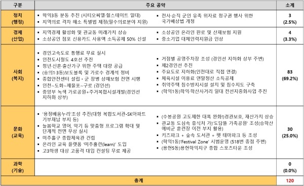 사회(복지) 공약이 전체의 69.2%를 차지했으며 다음으로 △문화(교육) 공약 25.0% △경제(산업) 공약 3.3% △정치(행정) 공약 2.5% △과학(기술) 공약 0.0%를 각각 기록했다.