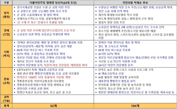 참고로 22대 총선에서 초선으로 당선된 염태영 의원과 경쟁한 박재순 후보가 제시한 공약은 104개며 정치(행정)(8)·경제(산업)(12)·사회(복지)(65)·문화(교육)(19)·과학(기술)(0)등으로 구성됐다.