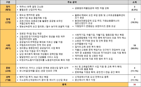 정치(행정) 공약은 △제주4·3 유족 결정 간소화 △불필요한 산업규제 해소 △금융범죄·체불임금에 대한 처벌 강화 등 3개다. 금융범죄·체불임금에 대한 처벌 강화는 제주갑 선거구에서 당선된 문대림 의원의 공약과도 일치한다.