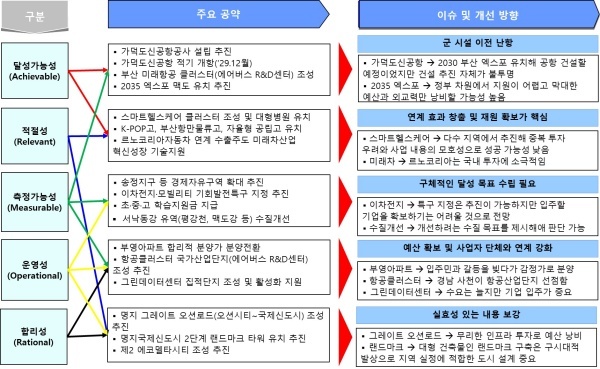달성 가능성은 4년 임기 내에 완료할 수 있는지를 평가하며 가덕도신공항공사 설립 추진, 가덕도신공항 적기 개항(′29.12월), 부산 미래항공 클러스터(에어버스 R&D센터) 조성, 2035 엑스포 맥도 유치 추진를 선정했다.