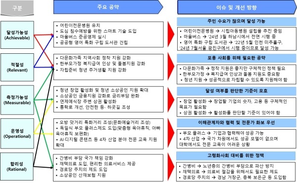 김희정 의원의 공약을 국정연이 개발한 갑옷(ARMOR), 즉 달성 가능성(Achievable)·적절성(Relevant)·측정 가능성(Measurable)·운영성(Operational)·합리성(Rational) 지표를 적용해 평가했다. 간략한 내역과 개선방안을 정리하면 다음과 같다.